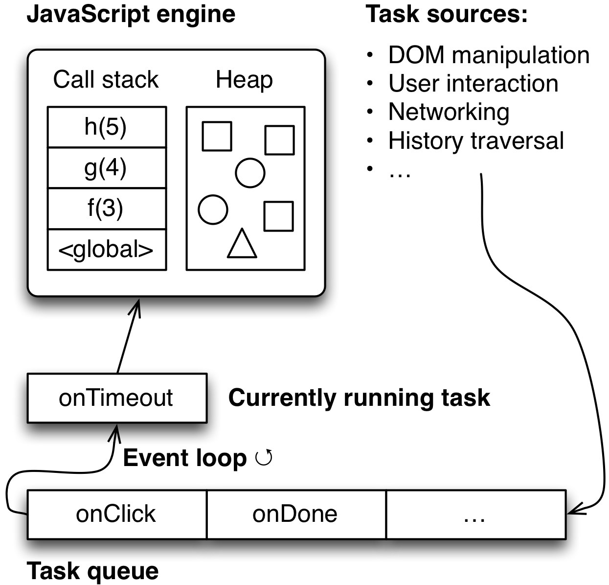 Elemente 2-4 sind Tasks, die JavaScript-Code ausführen, über die in den Browser eingebaute Engine. Sie terminieren, wenn der Code terminiert. Dann kann der nächste Task aus der Queue ausgeführt werden. Das folgende Diagramm (inspiriert von einer Folie von Philip Roberts [1]) gibt einen Überblick, wie all diese Mechanismen miteinander verbunden sind.